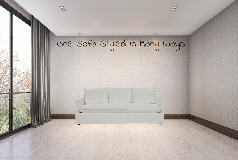 Well, here is a great beige sofa by Universal Furniture called the Siesta. Let’s take this bad boy and have some fun with color. I’m going to show you five different ways to style this sofa, using five different color palettes to add some pizzazz to your home. Spoiler alert: there will not be any blingy bullshit or more than one furry pillow in the mix! (ya gotta have one, lol)